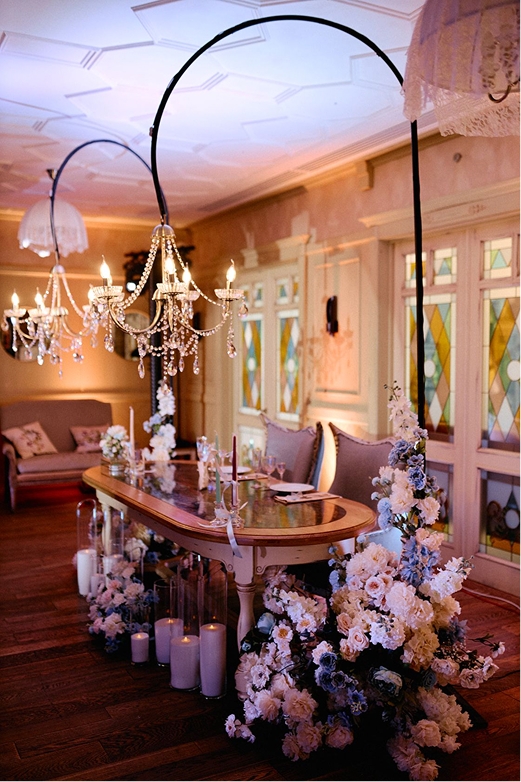 В процессе подготовке было принято провести выездную церемонию, а все мероприятие наделить глубоким смыслом и символикой пары. После общения и психологического портрета пары, мы решили поиграть с цветом и цветами. За основу взяли такие цвета, как бежевый, голубой, белый и зеленый. По своим значениям цвета абсолютно точно передали характер и принципы возлюбленных. Так родилась история «Символизм», которая отображалась не только в декоре, но и в деталях, а так же в сценарии мероприятия.