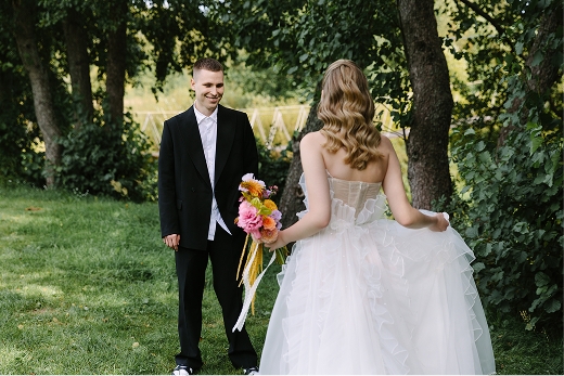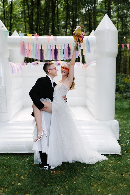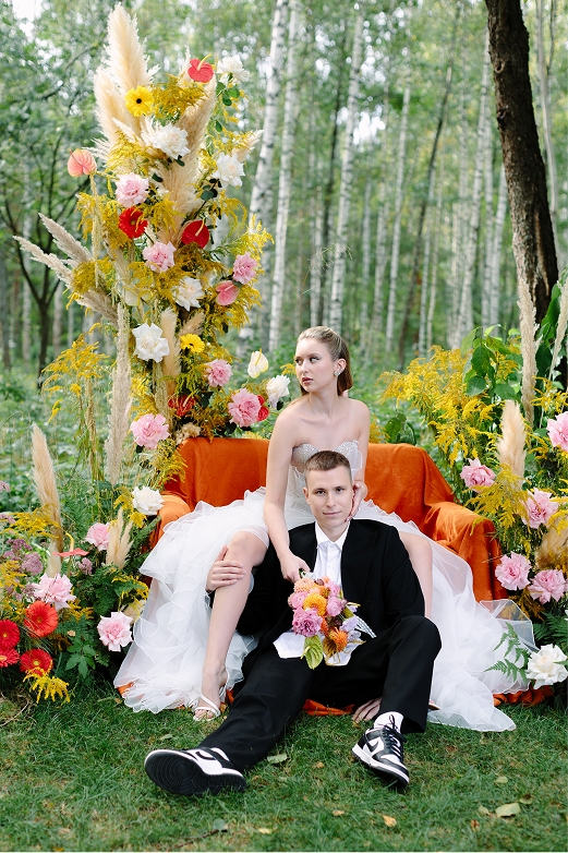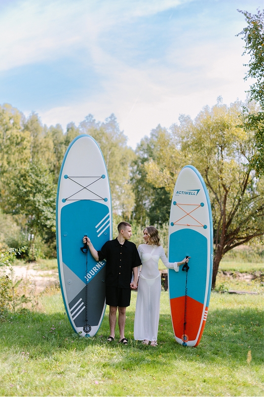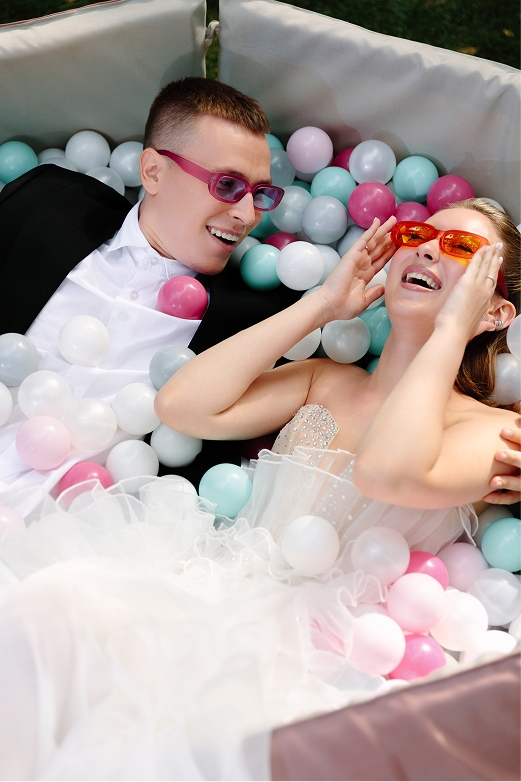 Вместо классического утра невесты - фотосъемка пары на реке на сапах. Цветочную арку заменил белоснежный батут с яркими деталями. Вместо стульев и банкетных столов с едой – пуфики, фуршет, бар и street food (даже с подачей горячих блюд).